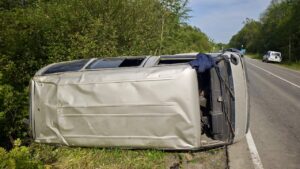 На Солнечной трассе Мазда опрокинулась в кювет, водитель серьёзно пострадал