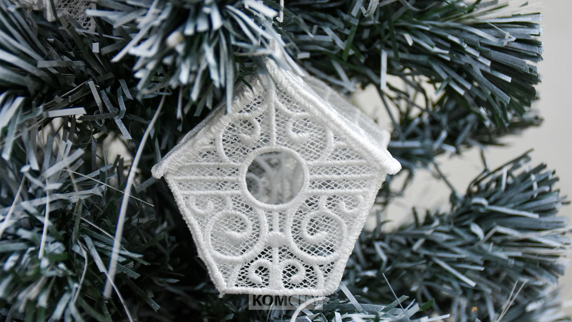 В выставочном зале разместилась и украшенная ёлка, на ней — игрушки мастерицы Ксении Лобжа, созданные в технике машинной вышивки.