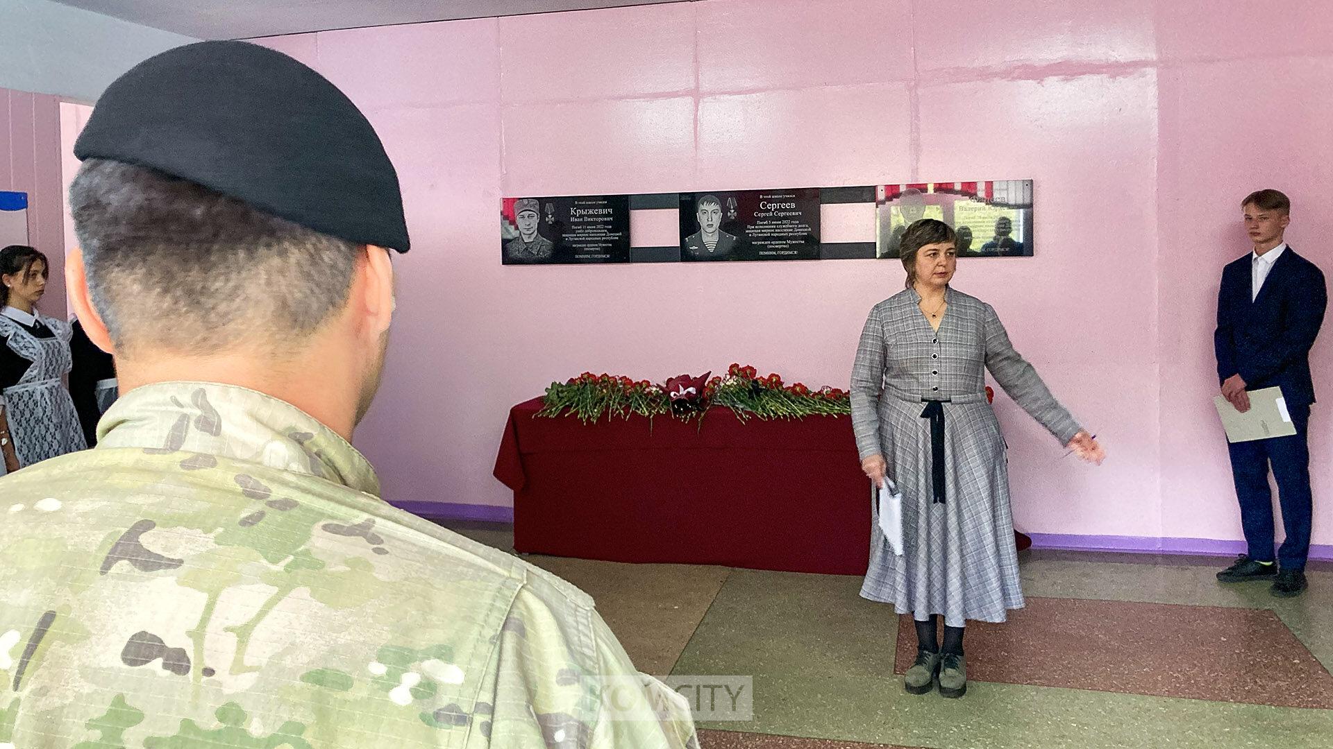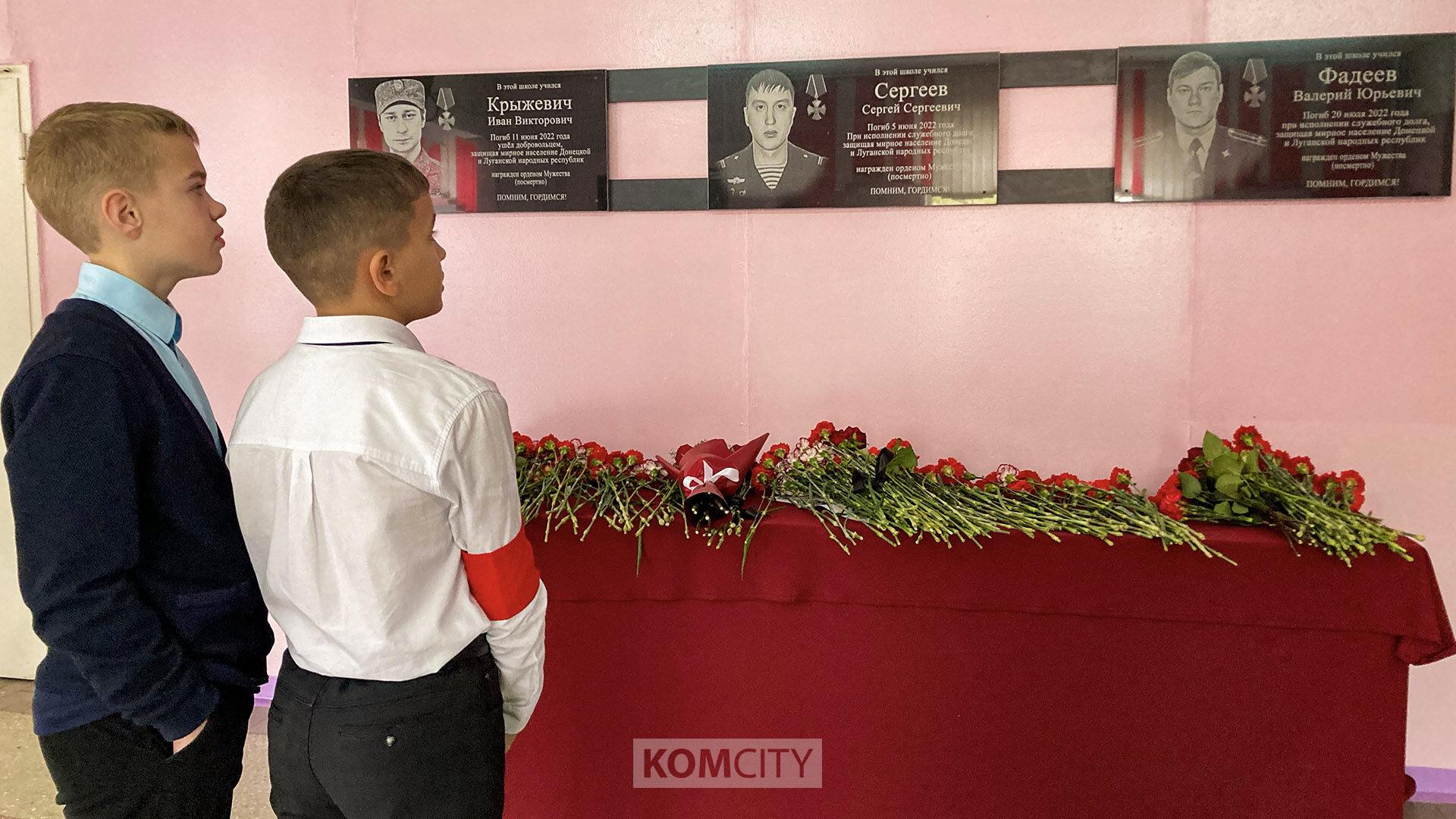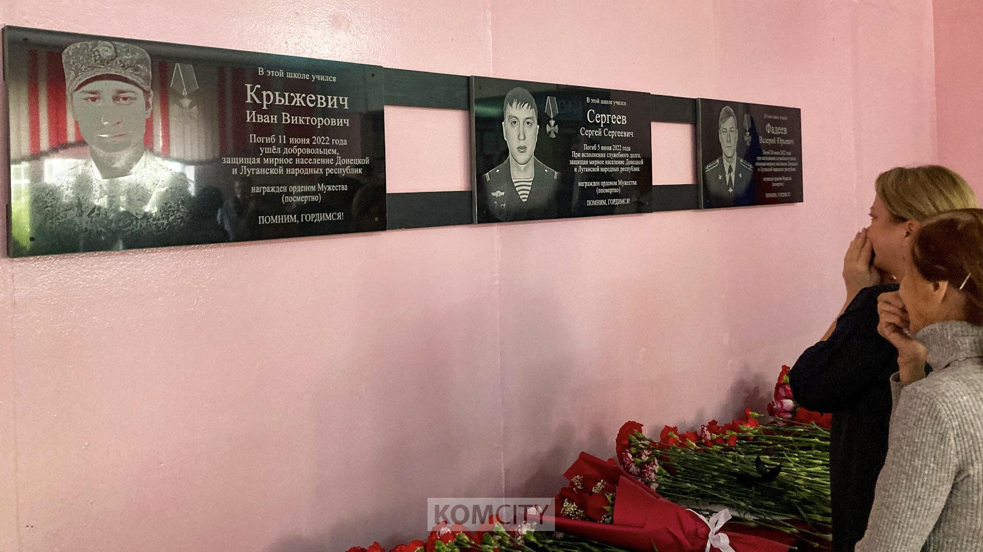 Мемориальные доски трём погибшим в ходе спецперации бойцам — Ивану Крыжевичу, Сергею Сергееву и Валерию Фадееву — открыли в школе 42. Все трое учились к этой комсомольской школе. Валерий и Иван были одноклассниками, первый служил в ОМОНе, второй отправился в зону СВО добровольцем.