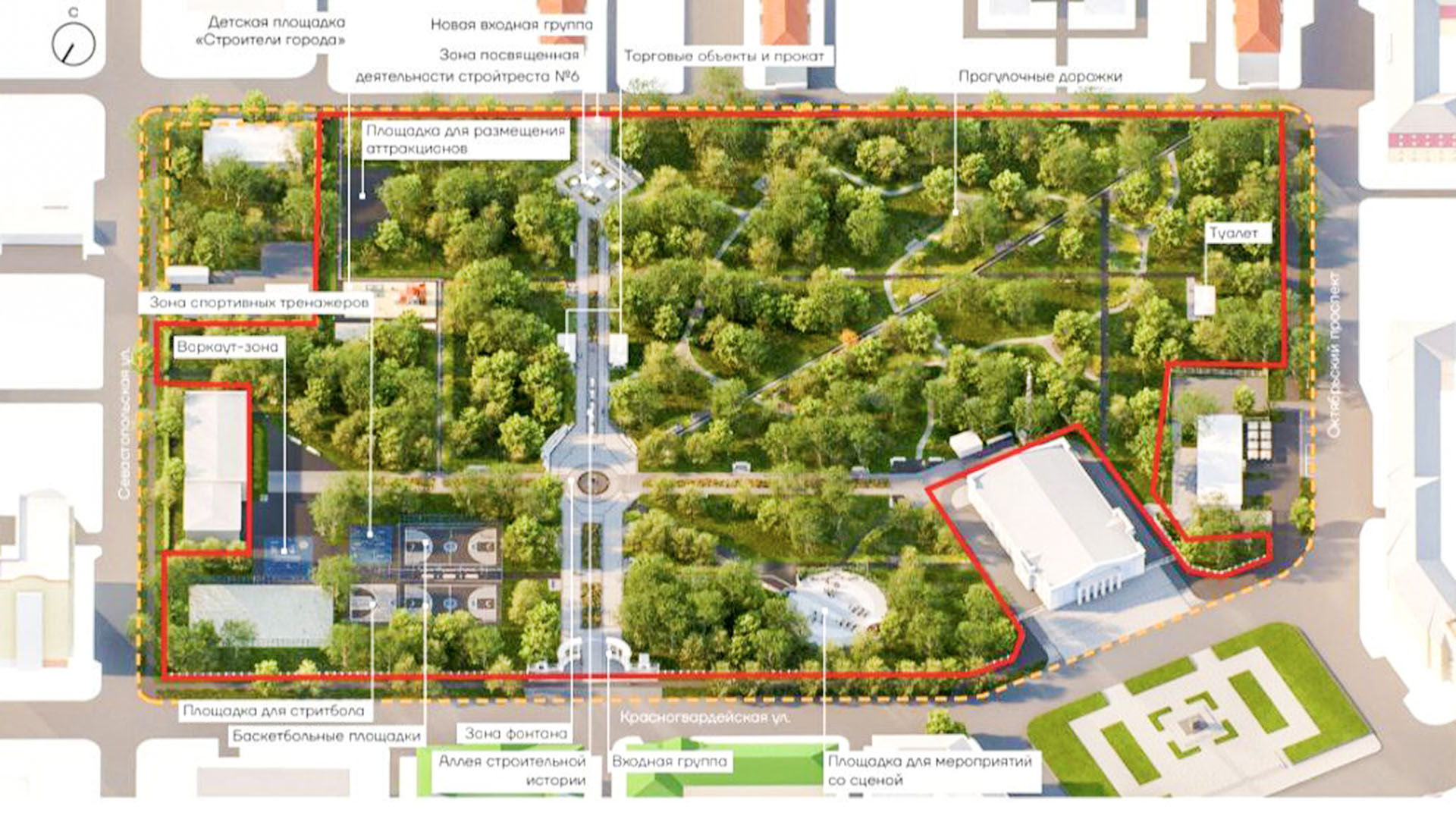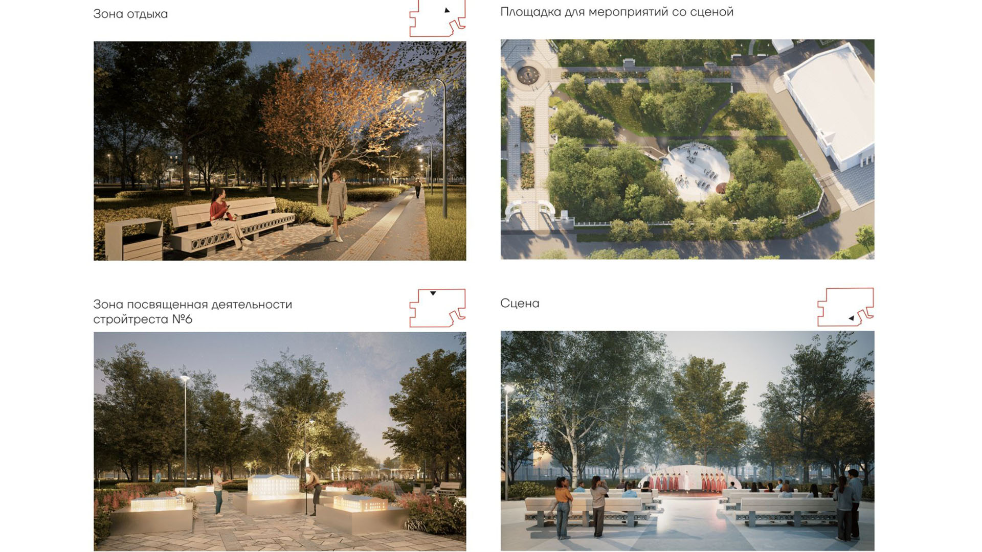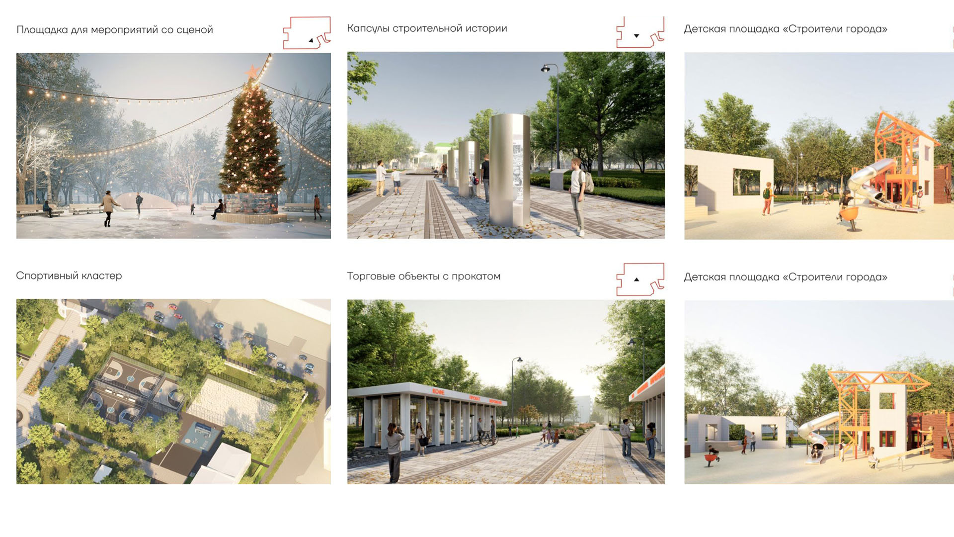 После всех работ в парке появятся Аллея Строительной истории, спортивная зона, детская площадка, территория аттракционов, территория, посвящённая деятельности стройтреста №6, территория торговых объектов и проката, площадка для мероприятий со сценой, прогулочные дорожки, входная зона и туалет. Масштабные работы должны закончить до конца года.