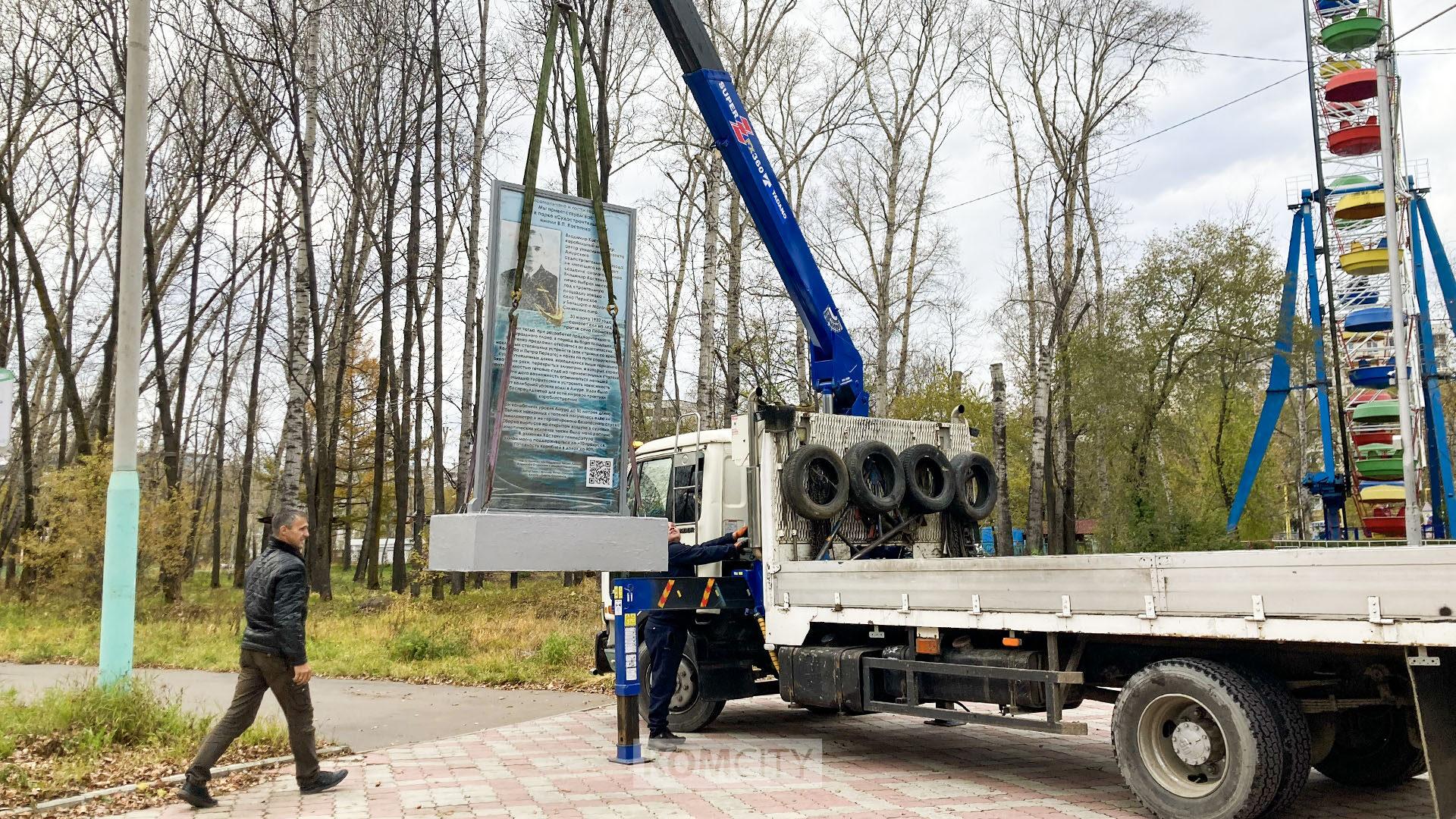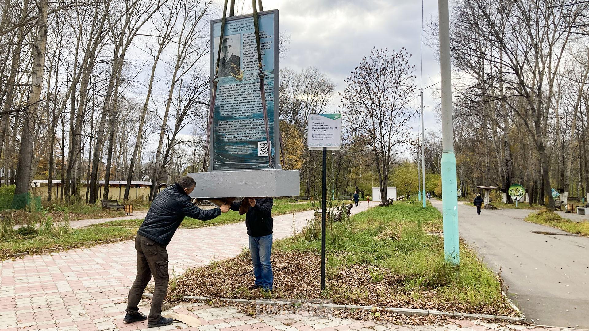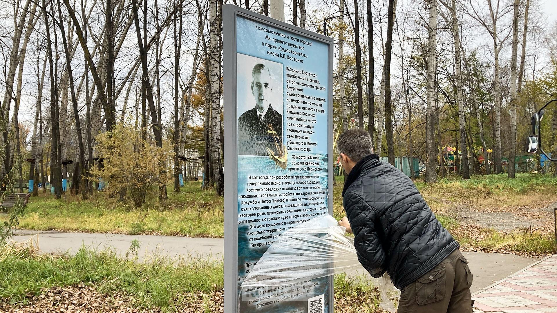 Накануне в парке Судостроителей, который с недавнего времени носит имя В. П. Костенко, установили информационный стенд об этом корабельном инженере, авторе проекта Амурского судостроительного завода. Автору идеи краеведу Антону Ермакову удалось осуществить проект благодаря поддержке неравнодушных жителей города: Антона Коляды, Владимира Старынина и Михаила Боровского.