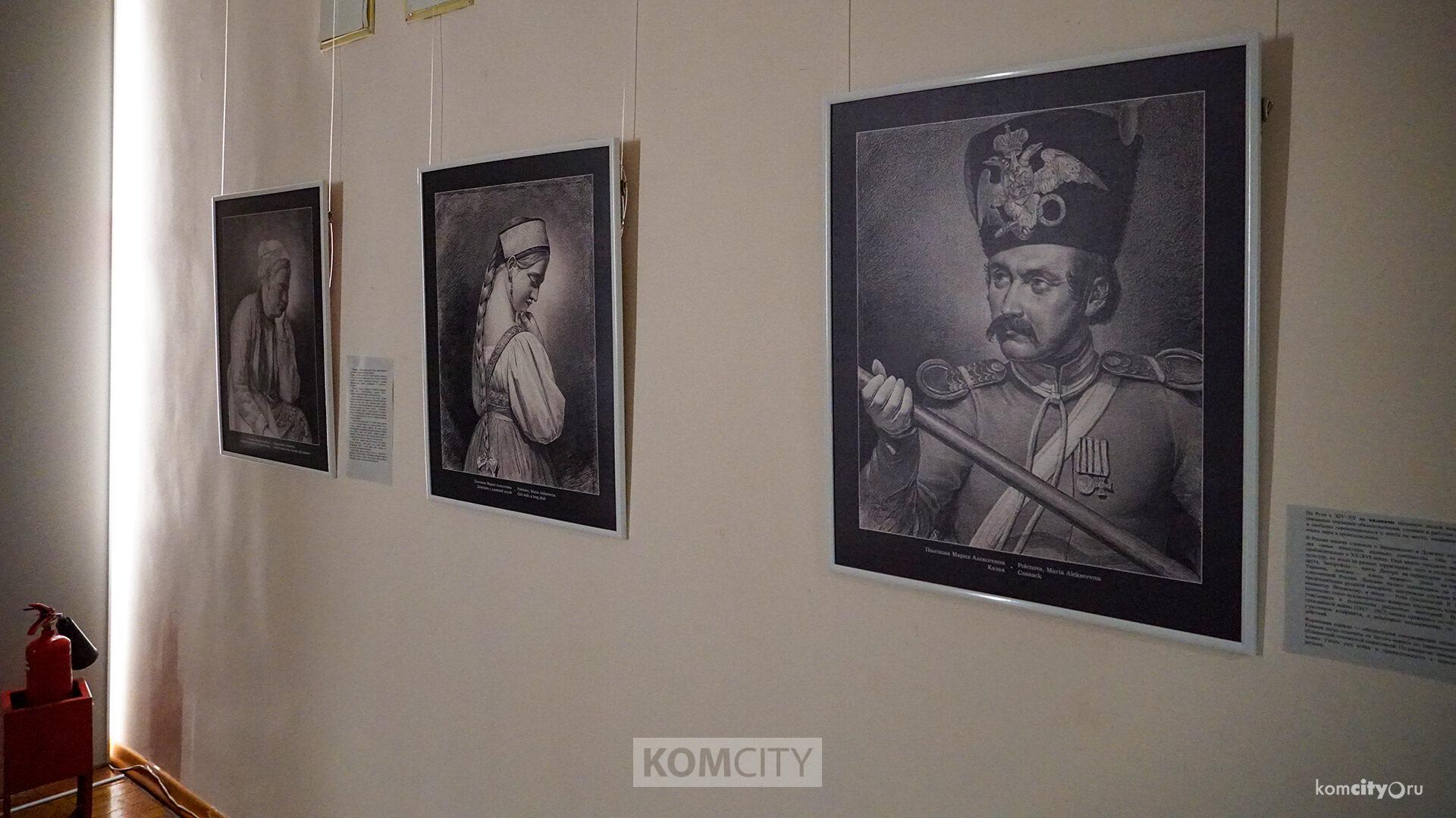 Мария Поленова писала графические портреты — родственников, детей и простых людей разных сословий. На её работах можно увидеть лавочника, трактирщика, кучера, казака, черкеса. Много женских портретов — итальянка, сибирячка, крестьянки в национальных костюмах. Рядом с картинами разместились описания предметов одежды того времени.